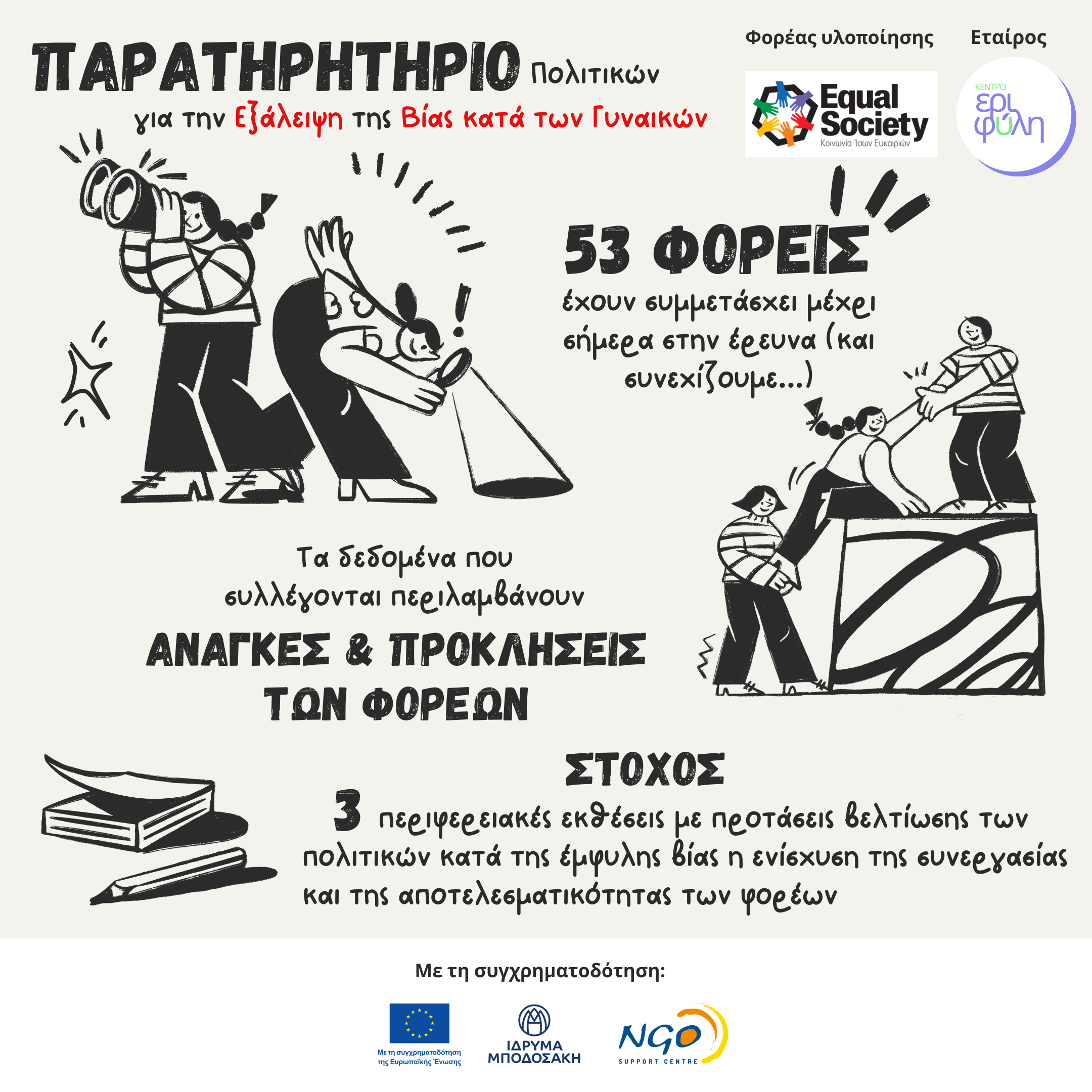 Το έργο «Παρατηρητήριο παρακολούθησης εθνικών, ευρωπαϊκών και διεθνών πολιτικών για την εξάλειψη της βίας κατά των γυναικών - Περιφέρειες Αττικής, Δυτικής Ελλάδας και Ιονίων Νήσων» υλοποιείται στο πλαίσιο του προγράμματος PREVENT, με φορέα υλοποίησης την Equal Society-Κοινωνία Ίσων Ευκαιριών και εταίρο το Κέντρο Εριφύλη. Το έργο “Preventing gender-based violence and violence against children” (PREVENT) έχει ως στόχο την πρόληψη και καταπολέμηση της έμφυλης βίας και της βίας κατά των παιδιών, μέσω της στήριξης οργανώσεων της Κοινωνίας των Πολιτών (ΟΚοιΠ) στην Ελλάδα και την Κύπρο που δραστηριοποιούνται σε αυτούς τους τομείς, καθώς και της ενίσχυσης των γνώσεων, των ικανοτήτων και της βιωσιμότητάς τους.Το PREVENT συγχρηματοδοτείται από την Ευρωπαϊκή ‘Ένωση μέσω του προγράμματος Citizens, Equality, Rights and Values (CERV), το Ίδρυμα Μποδοσάκη και το Κέντρο Στήριξης ΜΚΟ με συνολικό ποσό επιχορήγησης €2,3 εκ. Συντονιστής του PREVENT είναι το Ίδρυμα Μποδοσάκη (Ελλάδα), σε σύμπραξη με το Κέντρο Στήριξης ΜΚΟ (Κύπρος).