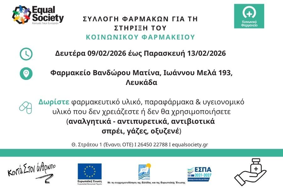 Η Equal Society θα πραγματοποιήσει συλλογή φαρμάκων με στόχο την ενίσχυση του Κοινωνικού Φαρμακείου που λειτουργεί ο Οργανισμός στο νησί της Λευκάδας. Η πρωτοβουλία αυτή αποτελεί μέρος της στρατηγικής μας για τη βελτίωση της πρόσβασης σε φαρμακευτική περίθαλψη και φροντίδα για τους ευάλωτους συμπολίτες μας που βρίσκονται σε ανάγκη.
